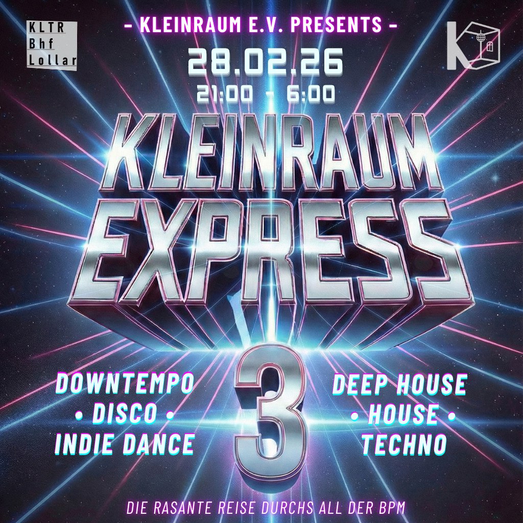 Alle mal herhören: Der Kleinraum Express nimmt wieder Fahrt auf! Am 28.02., um 21 Uhr, entgleisen wir zum dritten Mal gemeinsam der Alltagsroutine! Wir verwandeln den Kulturbahnhof erneut in unsere eigene Galaxie aus Discolichtern, Groove und guter Laune. Die Reise-Infos: • Tickets: Wie immer bis 22:00 Uhr für nur 5€, danach für 10€. • Safe…