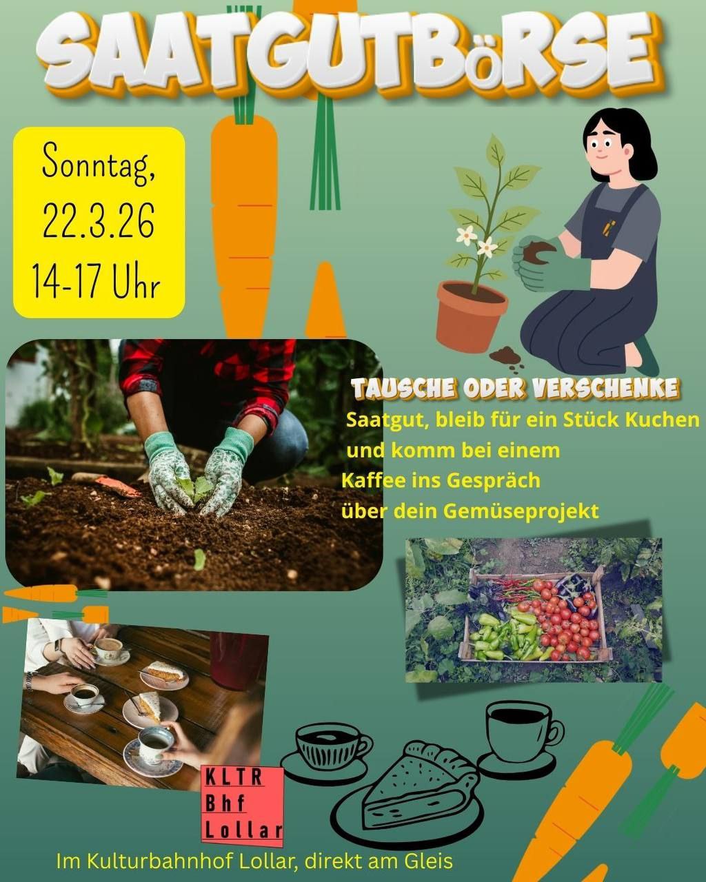 Am Sonntag, 22.03., von 14–17 Uhr im Kulturbahnhof Lollar. Zum Tauschen oder Verschenken, kommt ins Gespräch mit anderen Gartenbegeisterten und genießt Kaffee und Kuchen in gemütlicher Runde. Wir freuen uns auf ein schönes Zusammenkommen und eine ertragreiche Gartensaison! 🧑🌾👨🌾👩🌾 Neben Kaffee u Kuchen, erwartet euch eine Saatgutspende von jungesGemüse