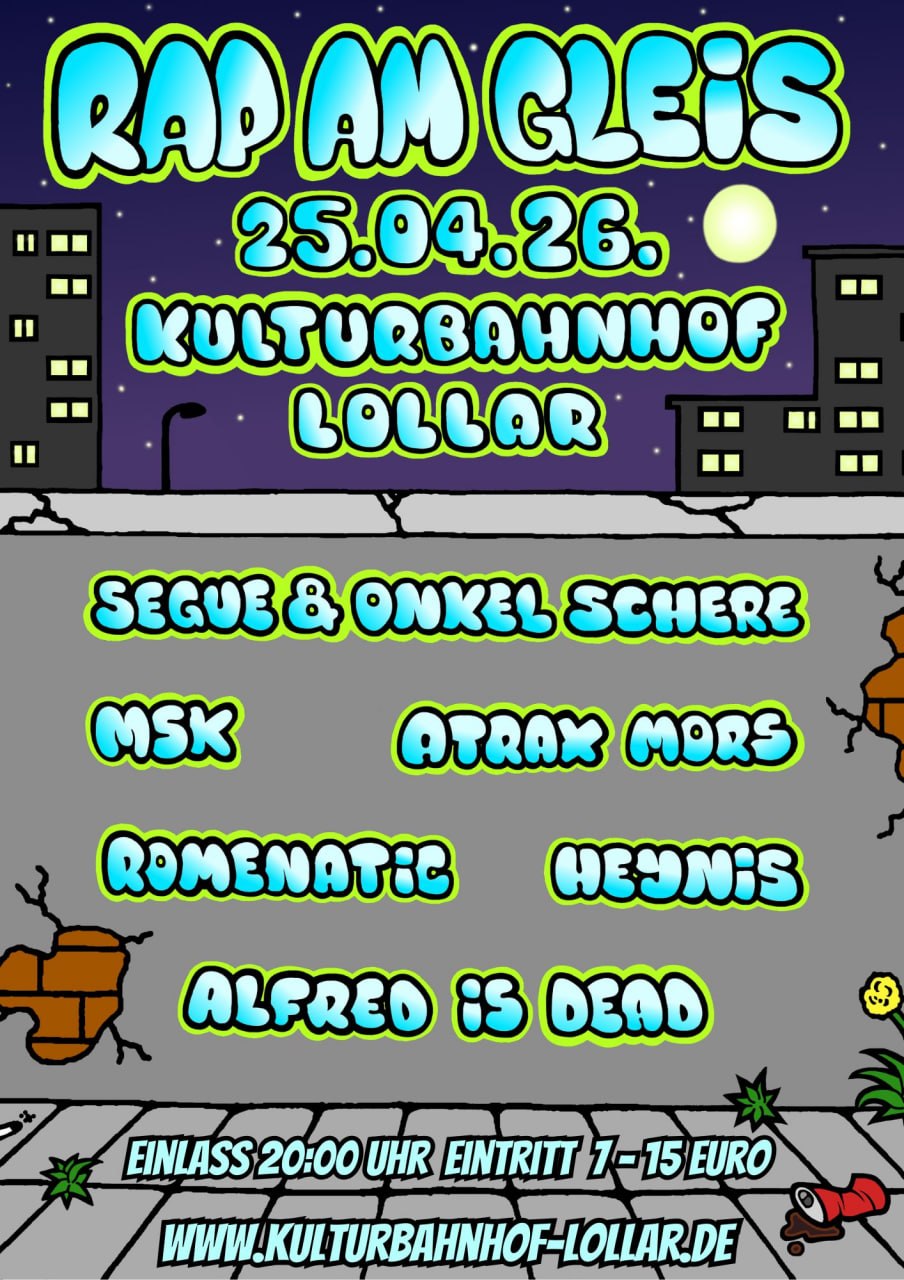 Einlass 20:00h Eintritt 7-15€ Auch in diesem Jahr heißt euch der Kulturbahnhof Lollar am 25.04.26 herzlich willkommen zu Rap am Gleis. Es gibt wieder eine geballte Ladung an Flows, Reimketten und fette Beats die garantiert für Nackenschmerzen sorgen werden.Zum Aufwärmen der Nackenmuskulatur geht es um 20.00 Uhr los mit einem funky DJ Set von Alfred…