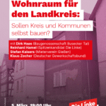 - DO 05.03.26 – Preiswerter Wohnraum für den Landkreis: Sollen Kreis und Kommunen selbst bauen?Bezahlbarer Wohnraum ist im Landkreis Gießen längst zur sozialen Frage geworden. Immer mehr Menschen suchen verzweifelt nach geeigneten Wohnungen – besonders kleine und preiswerte Wohnungen sind Mangelware. Gleichzeitig stehen im Landkreis tausende Wohnungen leer. Wie passt das zusammen? Und welche Rolle sollten Kreis und Kommunen bei der Schaffung von Wohnraum spielen? Diesen Fragen widmet sich…