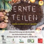 - SA 28.03.26 – Ernte Teilen – Anders Ackern für die Zukunft!Wisst ihr eigentlich, was hinter dem Kürzel „Solawi“ steckt? Solawi steht für Solidarische Landwirtschaft: ein Modell, bei dem Menschen gemeinsam eine Ernte finanzieren, Risiken teilen und direkte Beziehungen zwischen Hof und Tisch entstehen. Keine Supermarktlogik, kein Preisdruck – stattdessen: Verantwortung teilen. Wir zeigen den Film „Ernte Teilen – Anders Ackern für die Zukunft“ und freuen…