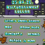 - SA 25.04.26 – RAP AM GLEISEinlass 20:00h Eintritt 7-15€ Auch in diesem Jahr heißt euch der Kulturbahnhof Lollar am 25.04.26 herzlich willkommen zu Rap am Gleis. Es gibt wieder eine geballte Ladung an Flows, Reimketten und fette Beats die garantiert für Nackenschmerzen sorgen werden.Zum Aufwärmen der Nackenmuskulatur geht es um 20.00 Uhr los mit einem funky DJ Set von Alfred…