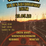- SA 25.04.26 – RAP AM GLEISEinlass 20:00h Eintritt 7-15€ Auch in diesem Jahr heißt euch der Kulturbahnhof Lollar am 25.04.26 herzlich willkommen zu Rap am Gleis. Es gibt wieder eine geballte Ladung an Flows, Reimketten und fetten Beats die garantiert für Nackenschmerzen sorgen werden.Zum Aufwärmen der Nackenmuskulatur geht es um 20.00 Uhr los mit einem funky DJ Set von Alfred…